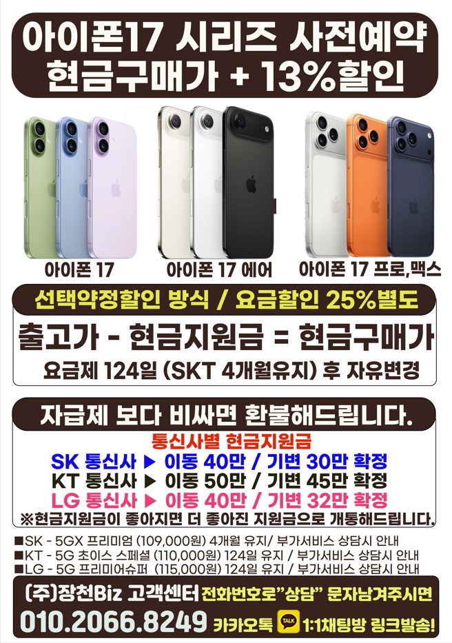 ■ (주)장천Biz 아이폰 17 시리즈 사전 예약 확정 가격 및 개통 조건 선택 약정 25% 요금 할인 방식입니다. 공시지원금은 미확정 SKT 번호 이동 개통 요금제 : 5GX 프라임 플러스 (99,000원 > 요금 할인 시 74,250원) SKT 기기 변경 개통 요금제 : 5GX 프리미엄 (109,000원 > 요금 할인 적용 시 81,750원) 공통 요금제 유지 기간 4개월 유지 후 자유 변경 예시) 25년 10월 개통 시 26년 2월 1일 변경 가능 (단, 다이렉트 요금제는 변경 불가) 공통 부가서비스 *마이스마트콜픽3 *TALL케어+5 아이폰 보험 12월 1일 삭제 ■■아이폰 17 256G 출고가 : 1,287,000원 이동 할부 원금 : 890,000원 현금 > 상품권 구매