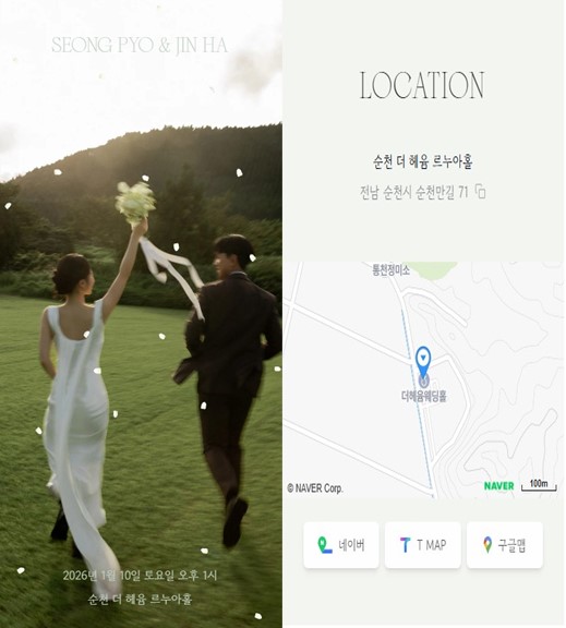 ▣ 장소 : 순천 더 혜윰 르누아홀 (전남 순천시 순천만길 71 / 오천동 389 ) ▣ 마음 전하실 곳 : 농협은행 302-2409-2160-81 (예금주 : 임성표) ▣ 연락처 : 임성표 조합원 (☎ 010-2409-2160) ▣ 모바일청첩장 주소 : https://toourguest.com/cards/congpyo0110